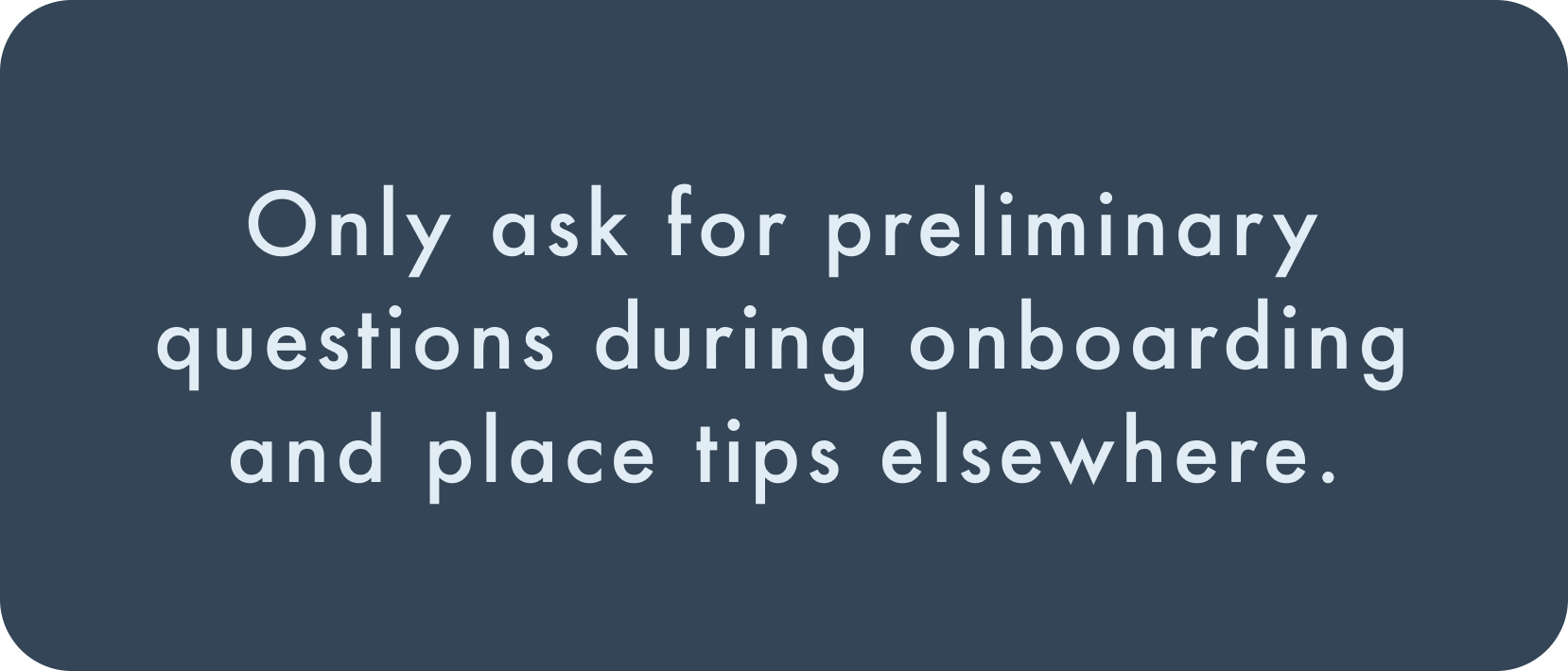 With this information in mind, I went back to the drawing board, having to hold the users’ needs and the design of the existing app in tension. I came to the conclusion that in order to keep my users engaged I needed to create as few steps as possible and give them the information they needed when they needed it. Rather than dumping all the information in the onboarding process, I decided to only ask necessary preliminary questions in onboarding and place tips elsewhere.