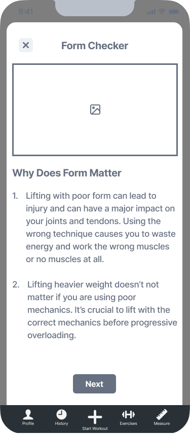 I created two onboarding flows, one for beginners and the other for experts as our research showed that experienced lifters did not need the same information about the importance of form. This allowed more seasoned lifters to move directly to needed information about how to use the feature. My user flow also allowed me to find an initial solution for entering measurement information, where users were redirected to the existing measurement screen and back to onboarding.