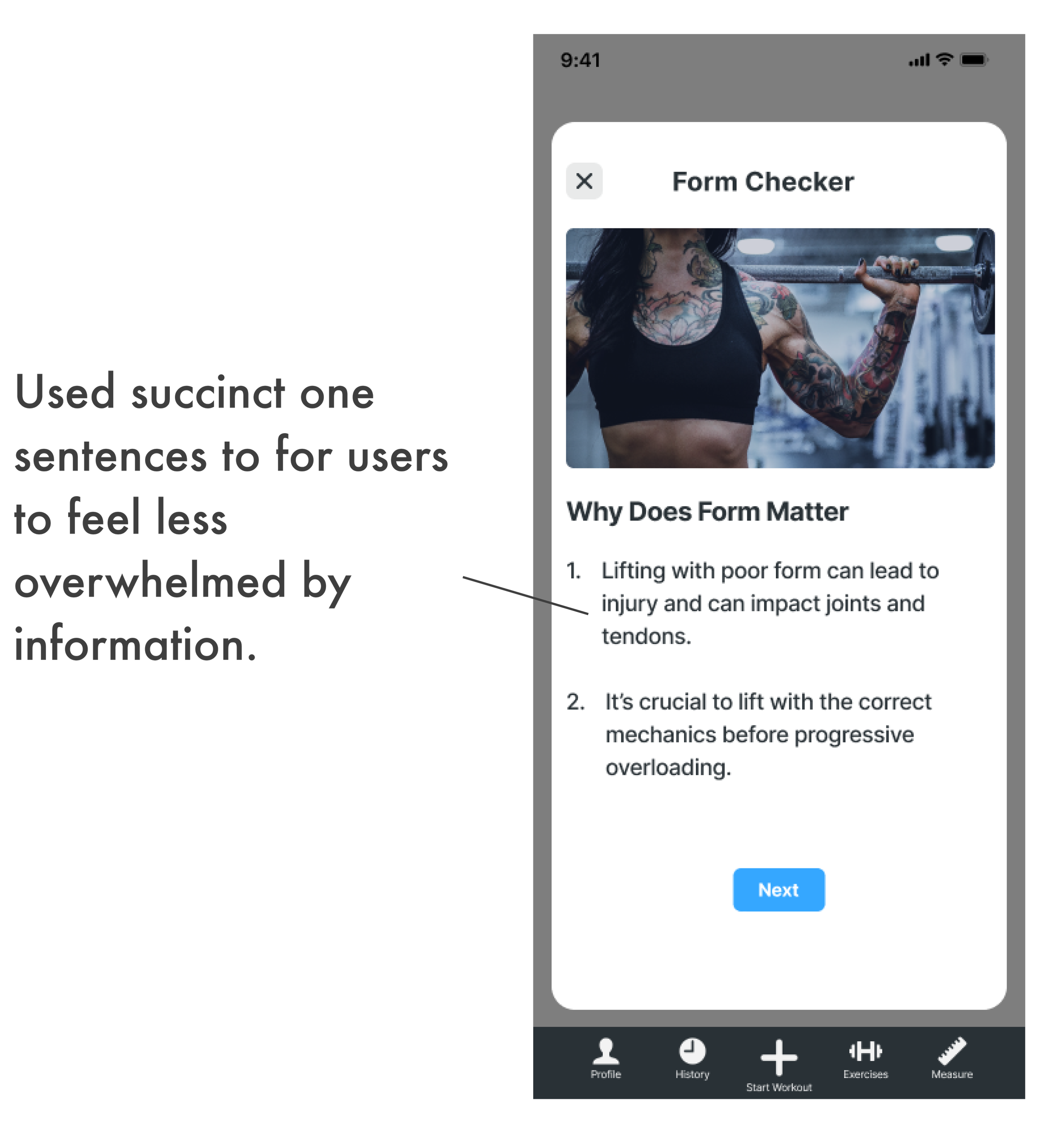 Through testing, I found that the onboarding section was the main source of confusion for users. No participants read any onboarding information and did not understand that they needed to navigate to the measurement page to input information needed for their personlised lifting animation. There was also a lack of clarity about how the feature worked and uploading videos.