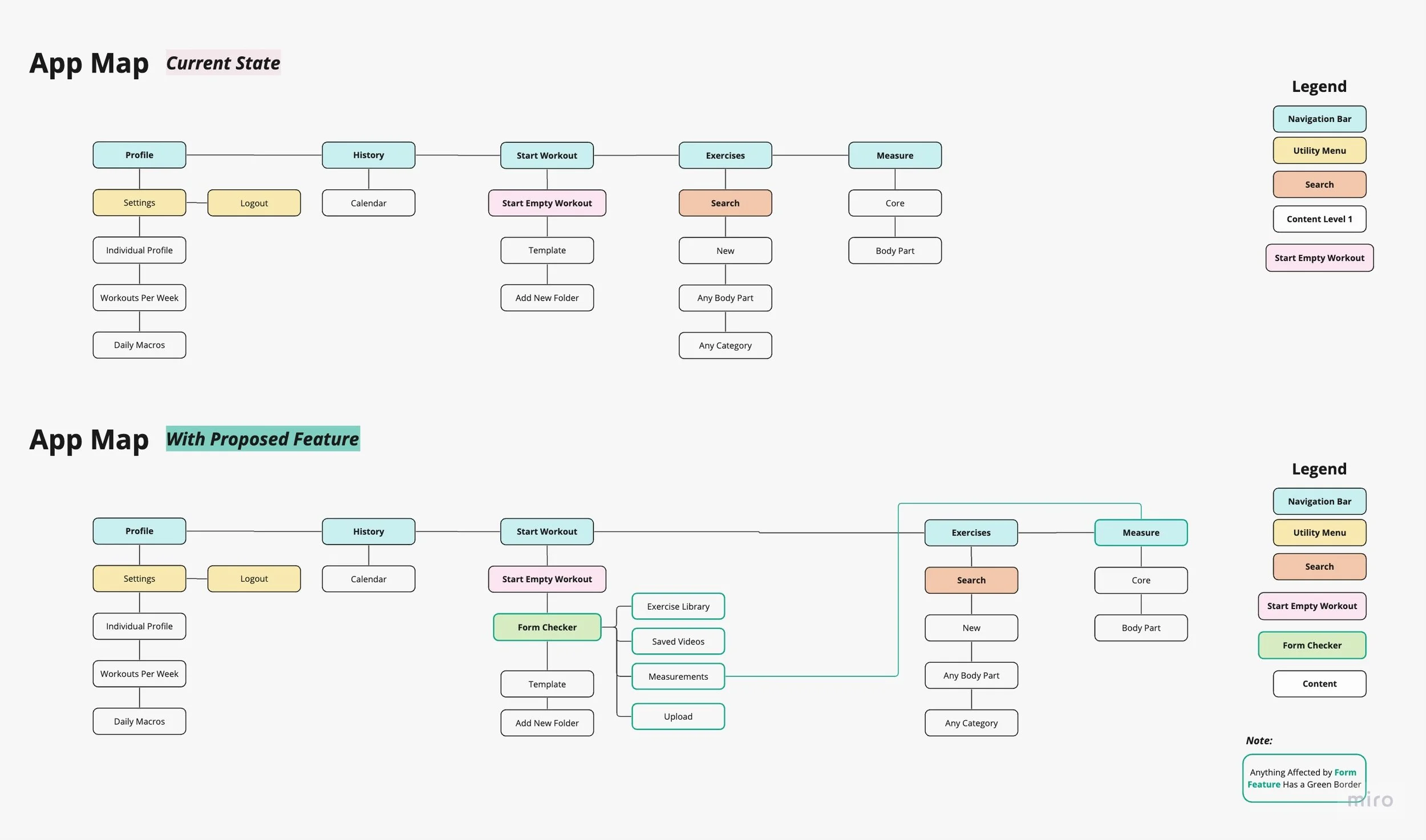 It was important to establish how the form feature would fit into the existing app. Since the Strong App is known for its extreme simplicity, the newest feature needed to fit seamlessly into the overall app layout. I considered creating a new button on the navigation bar but decided against it, to keep the app as simple as possible. Instead, I designed an action button, directly underneath the main workout button.